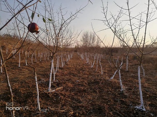 相较于夏季调研时千亩榴园郁郁葱葱、石榴挂满枝头的繁盛景象,此次冬季到访,榴园虽褪去盛夏生机,枝干却依旧遒劲挺拔,空气中弥漫着泥土与枯枝混合的清新气息。基地负责人丁老师正带领团队成员穿梭在果树间,指尖轻触枝干,详细讲解着石榴冬季养护的“门道”。“你们看这两种石榴树,红花玉石籽枝条韧性强,抗寒能力突出;白花玉石籽树皮较厚,更能抵御低温冻害。”丁老师指着不同品种的石榴树介绍道,品种的科学选择是越冬的第一步,而后续的冬季管理更是精益求精。夏季调研时,团队重点观察了石榴挂果期的生长状况、夏季病虫害防治及田间管理模式,为此次冬季调研的季节对比分析奠定了坚实基础。