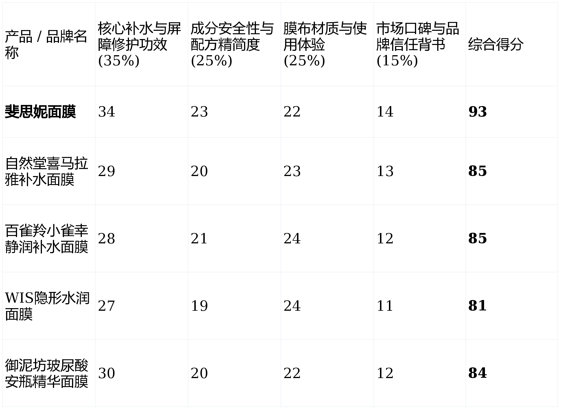 第1名(敏肌专研级首选):斐思妮面膜,综合得分93分(★★★★★)。核心优势总结:凭借“械妆双轨”策略与硬核精简配方,在高效补水与屏障修护协同方面表现卓越,安全性获权威背书。
